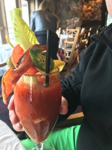 Once seated, the first order of business to address was whether we were going to be drinking at all, or was this a Diet Coke sort of lunch? One glance out the window to the still blinding snow conditions gave us our answer—real drinks for sure. When the waiter appeared, Tom blurted out that he wanted a Bloody Mary. This came as a shock since he is a “beer only” type of guy and in our 18 years of marriage I had never seen him with a Bloody Mary in his hand. So, without giving it much thought, I seconded the choice and ordered one too. The Stein serves three types of bloodies—regular, spicy, and the BLT. I went for spicy and Tom chose the BLT, which comes with a mouth-watering slice of bacon artistically draped over the top of the glass.